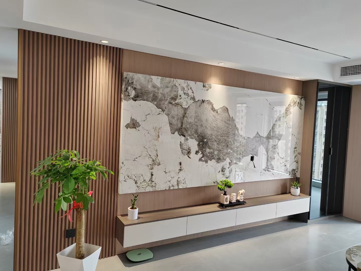 玄关空间留白为主,配以木纹饰面的舒抗板装饰,木白相间,感受到自由呼吸的敞亮和愉悦。中古的家具、艺术品及摆件都是设计师与屋主精心挑选而来,它们都以其固有的温润和有机形态,赋予空间一些的精致感,使自然、柔