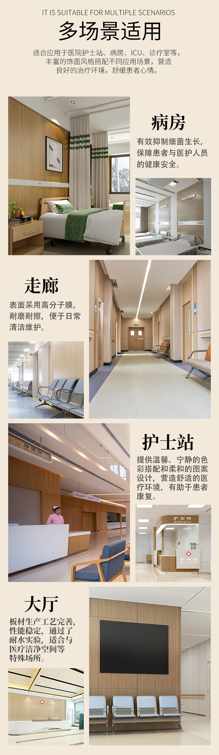 医院的不同区域,如手术室、清洁室、走廊墙壁和门诊大厅,均使用冰火板作为室内吊顶板和护墙板。