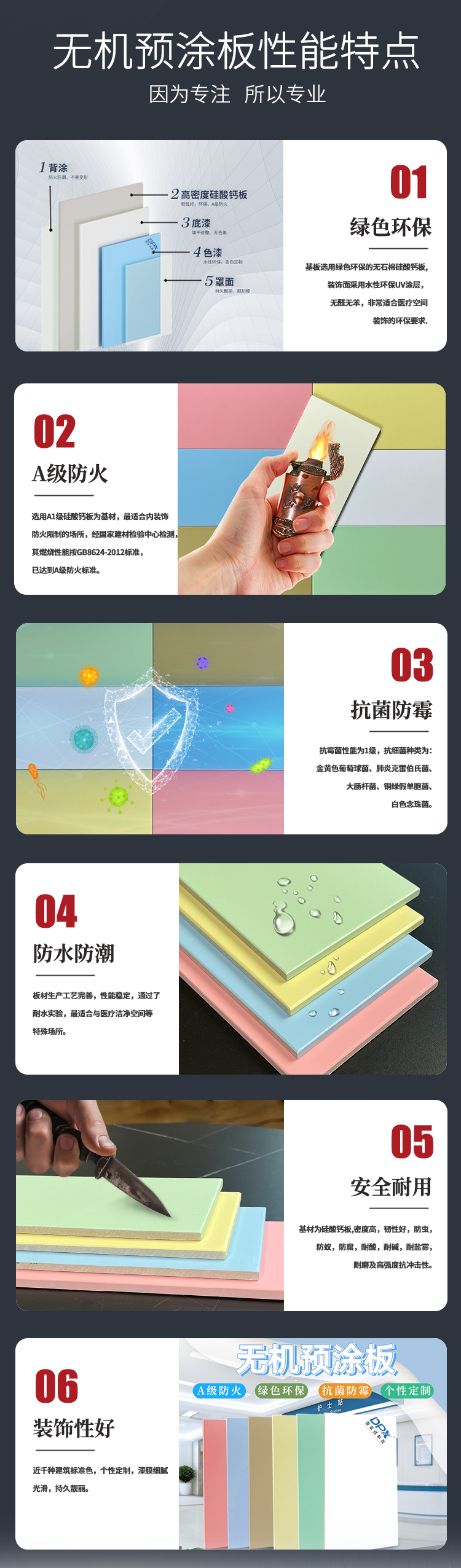 综上所述,无机预涂板凭借其良好的性能和广泛的应用前景,必将在建筑行业中发挥越来越重要的作用,为人们提供更安全、更环保、更舒适的生活和工作空间。