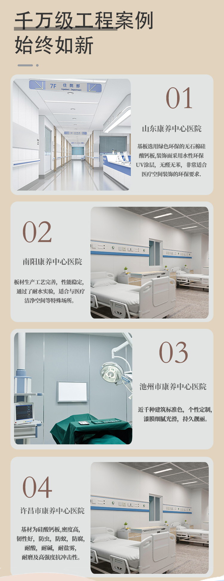 当前位置:首页 > 新闻中心 医院作为守护生命与健康的堡垒,其内部环境的安全性是所有医疗活动有效开展的基础。患者的康复、医护人员的高效工作,都离不开一个安全、洁净、可靠的物理空间。在医院全场景的建设与升级中,无机预涂板凭借其在防火、防霉、防潮、抗冲击等方面的综合效用,为构建一道坚实的安全屏障,提供了有力的支持。