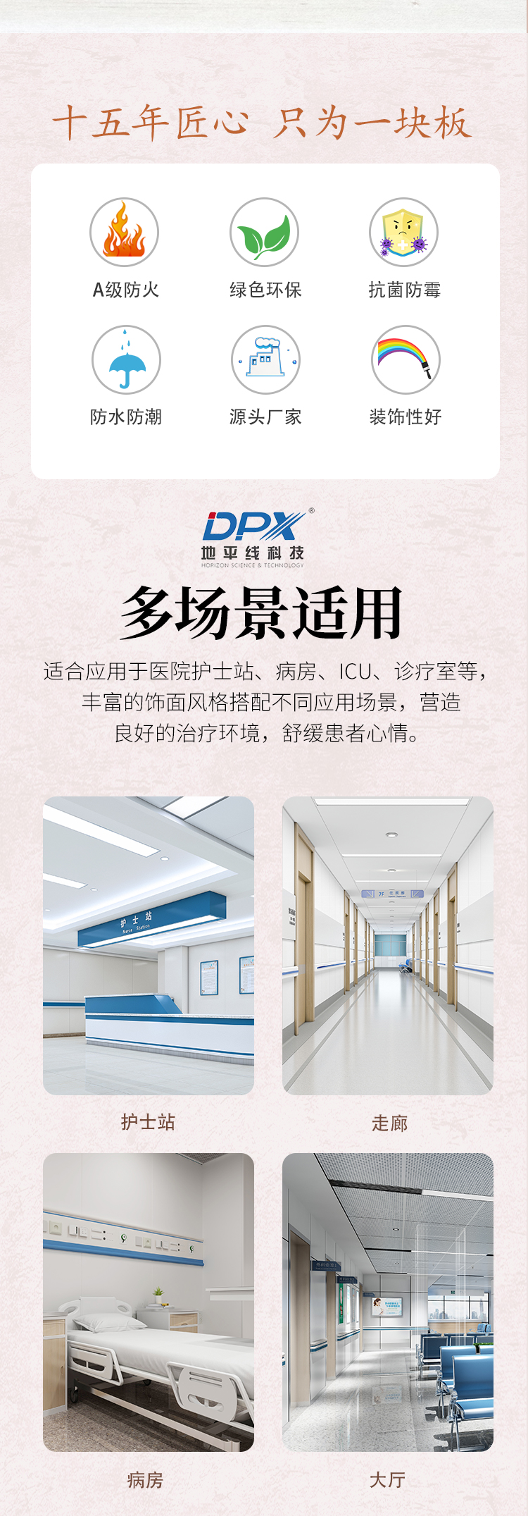 当前位置:首页 > 新闻中心 在康养医院场景中,建材不仅是空间装饰的载体,更是守护患者、医护人员健康与安全的 “隐形屏障”。不同于普通医院,康养医院兼具医疗治疗与长期照护功能,入住人群多为老年患者或康复期人群,体质敏感且免疫力较弱,对环境的安全性、健康性、舒适性要求更为严苛。而无机预涂板凭借 “防火 + 防潮 + 抗菌” 三合一的优势,匹配康养医院的特殊需求,成为当下康养医疗空间建材选择中的优质板材。
