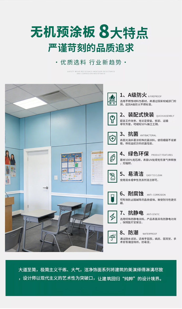 当前位置:首页 > 新闻中心 “孩子在学校安不安全?” 每天清晨送孩子入校,这句话都是家长心头的牵挂。校园作为人员密集的育人场所,消防安全更是底线中的底线。从教学楼的走廊转角,到实验室的墙面柜体,从楼梯间的生命通道,到宿舍食堂的高频区域,墙面材料的选择,直接关乎数千名师生的生命安全。无机预涂板凭借A 级不燃的硬核性能,搭配环保抗菌、抗冲击耐用的综合优势,成为校园防火安全的 “隐形卫士”,让学校安心管理,让家长放心托付。