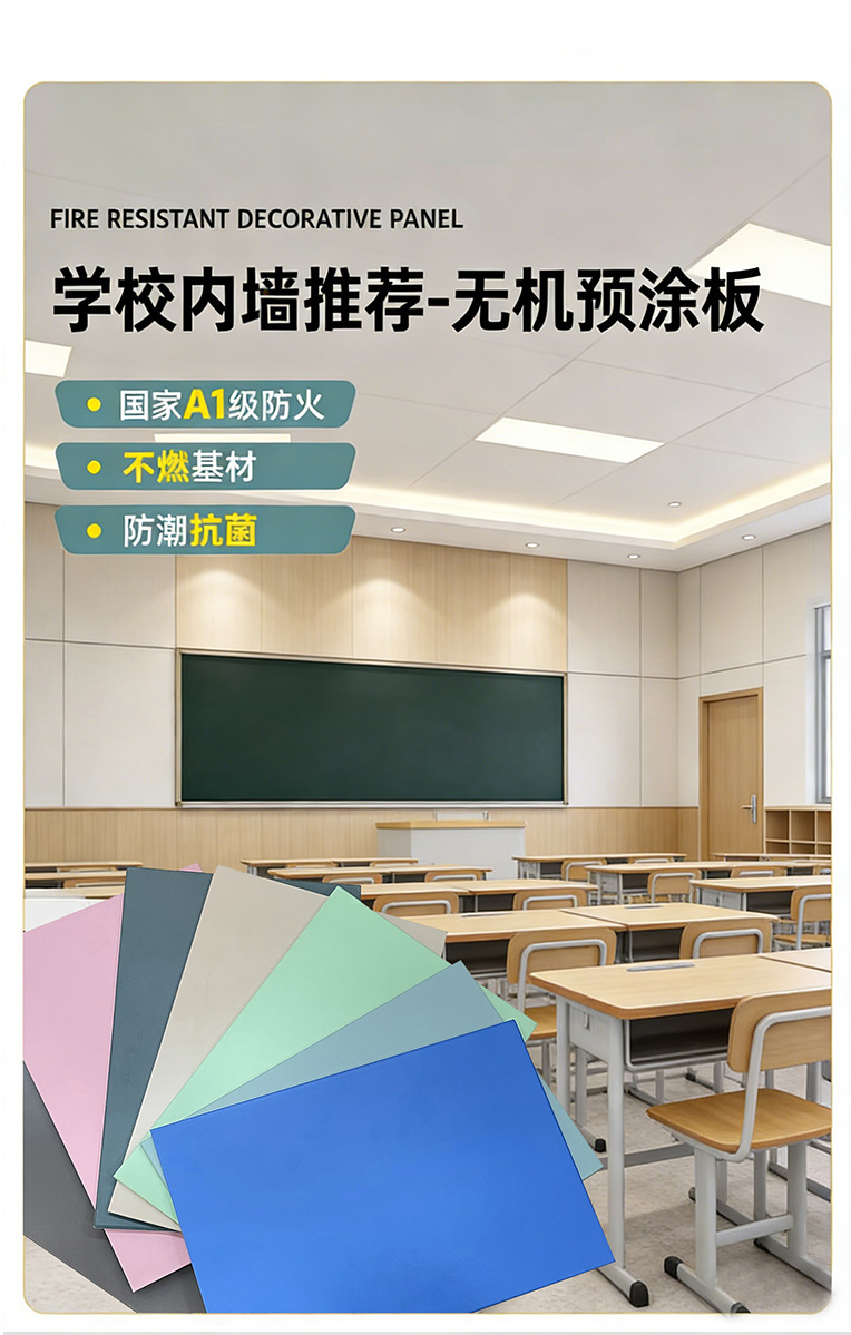 无机预涂板已广泛应用于多地中小学、幼儿园的新建与改造项目中,成为校园建设的 “标配材料”。在教学楼,它守护着孩子的课堂时光;在楼梯间,它筑牢了生命疏散的通道;在宿舍,它陪伴着孩子的休息时刻;在实验室,它抵御着潜在的火情风险。每一块板材,都是对校园安全的郑重承诺;每一处应用,都是对家校信任的用心回应。