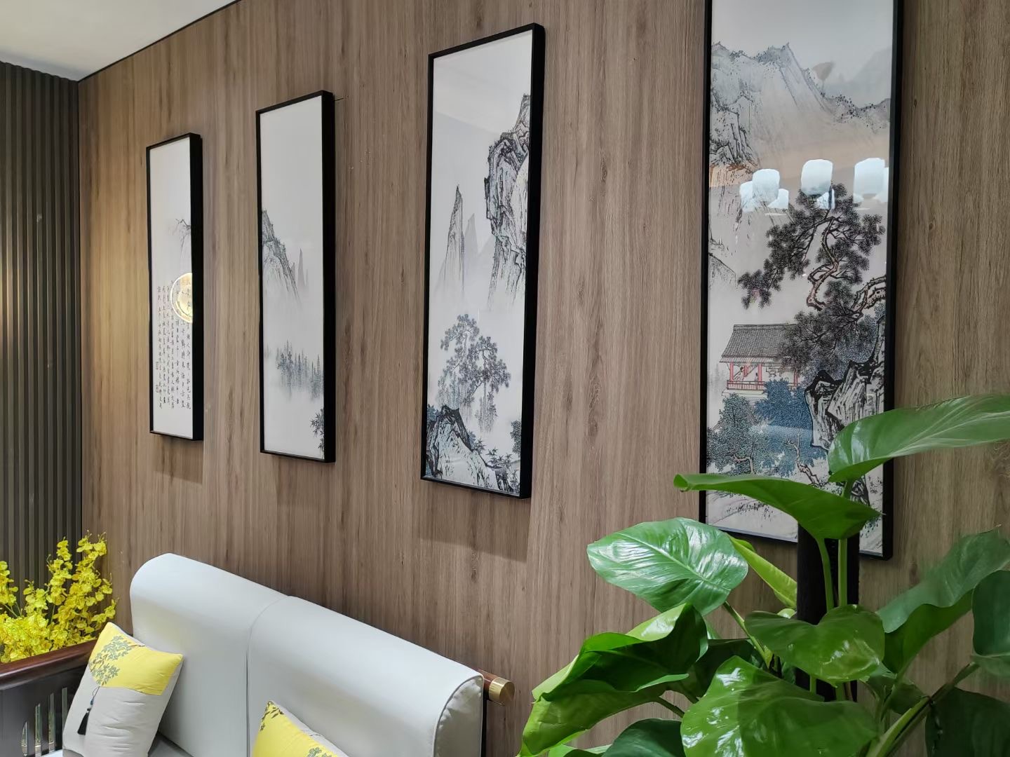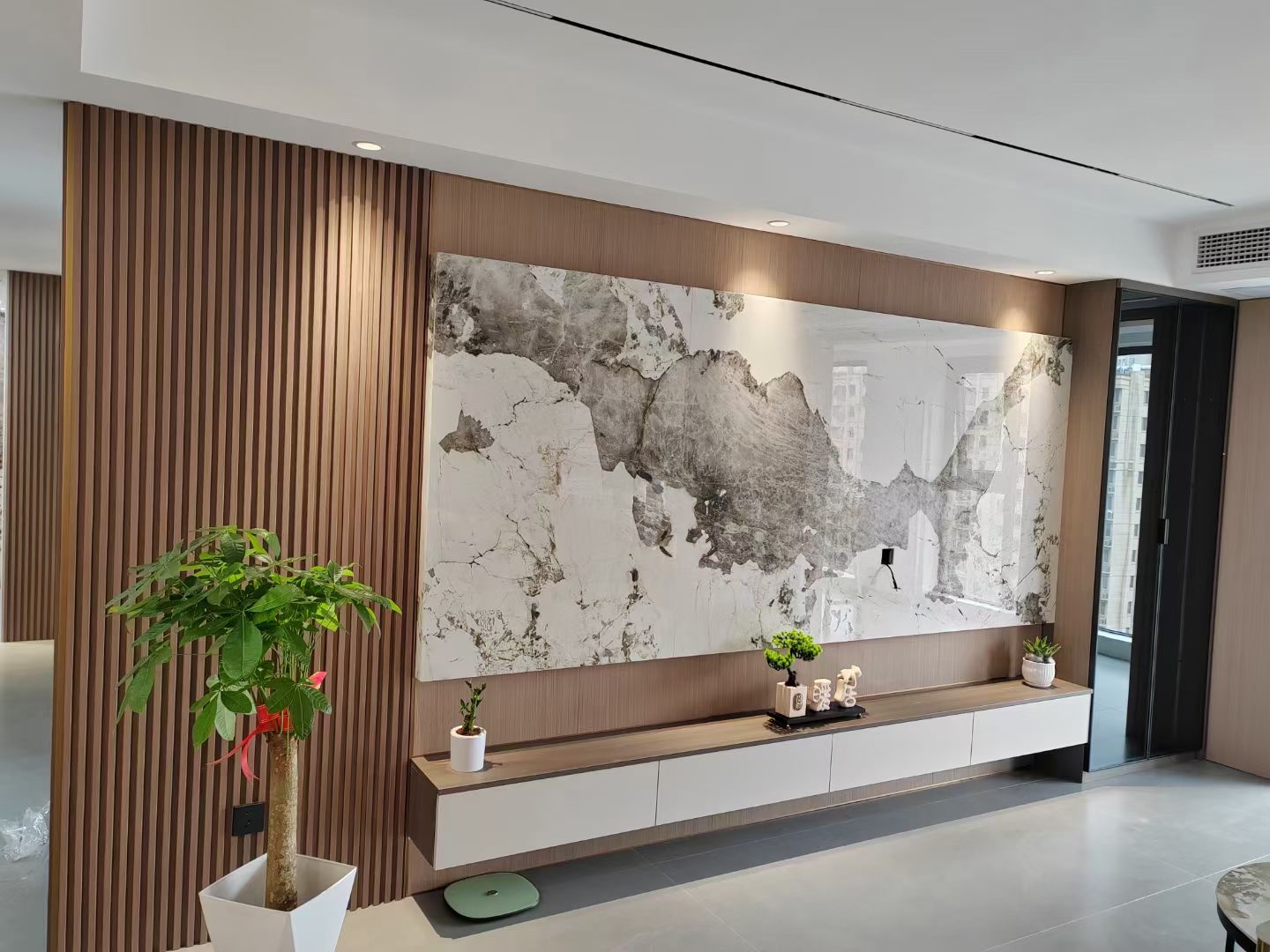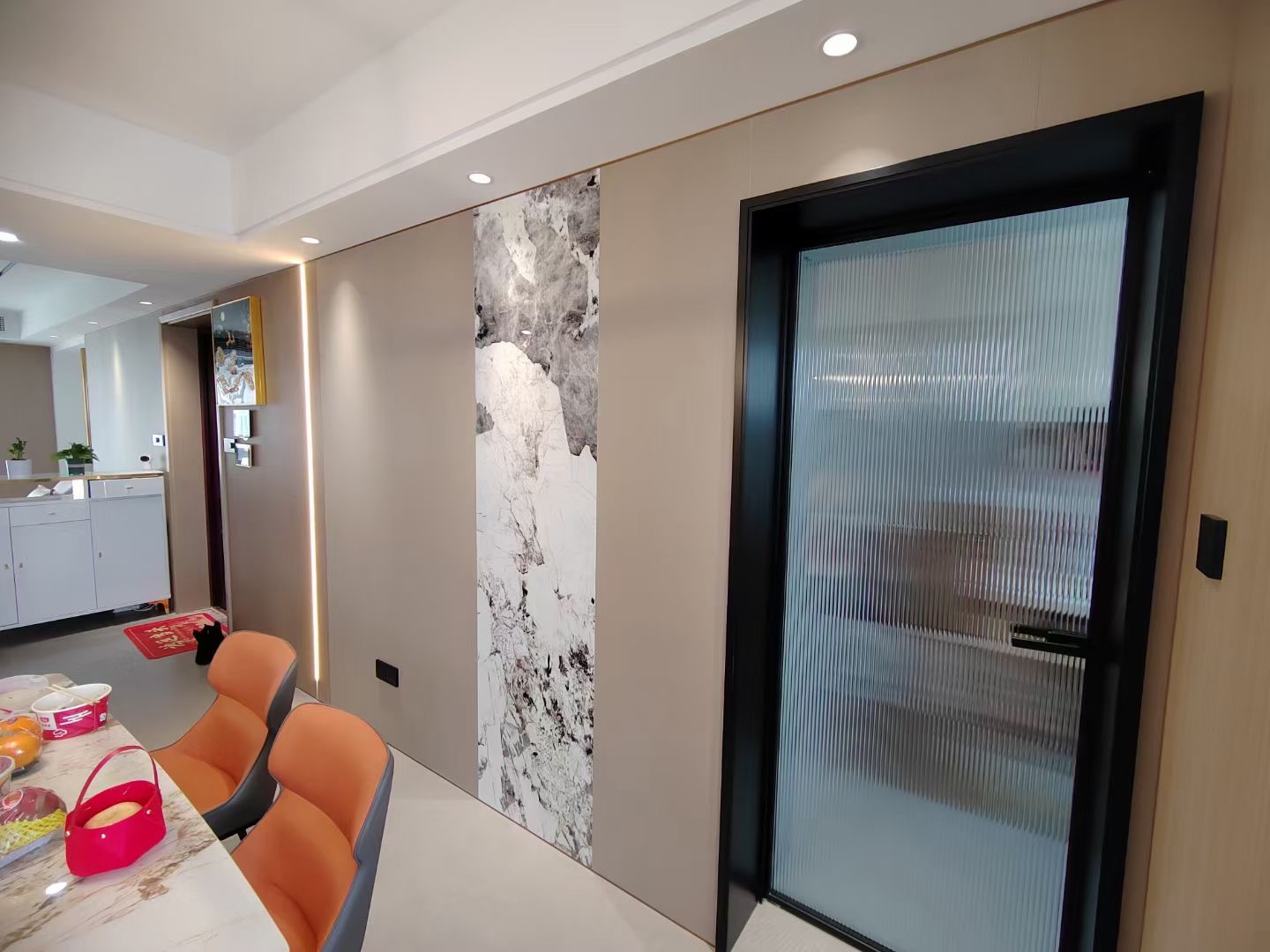 当前位置:首页 > 新闻中心 玄关空间留白为主,配以木纹饰面的舒抗板装饰,木白相间,感受到自由呼吸的敞亮和愉悦。中古的家具、艺术品及摆件都是设计师与屋主精心挑选而来,它们都以其固有的温润和有机形态,赋予空间一些的精致感,使自然、柔和的色调和柔软的材料彼此映衬。内部胡桃木饰面和石材的使用创造了家庭般的柔和与温馨氛围。