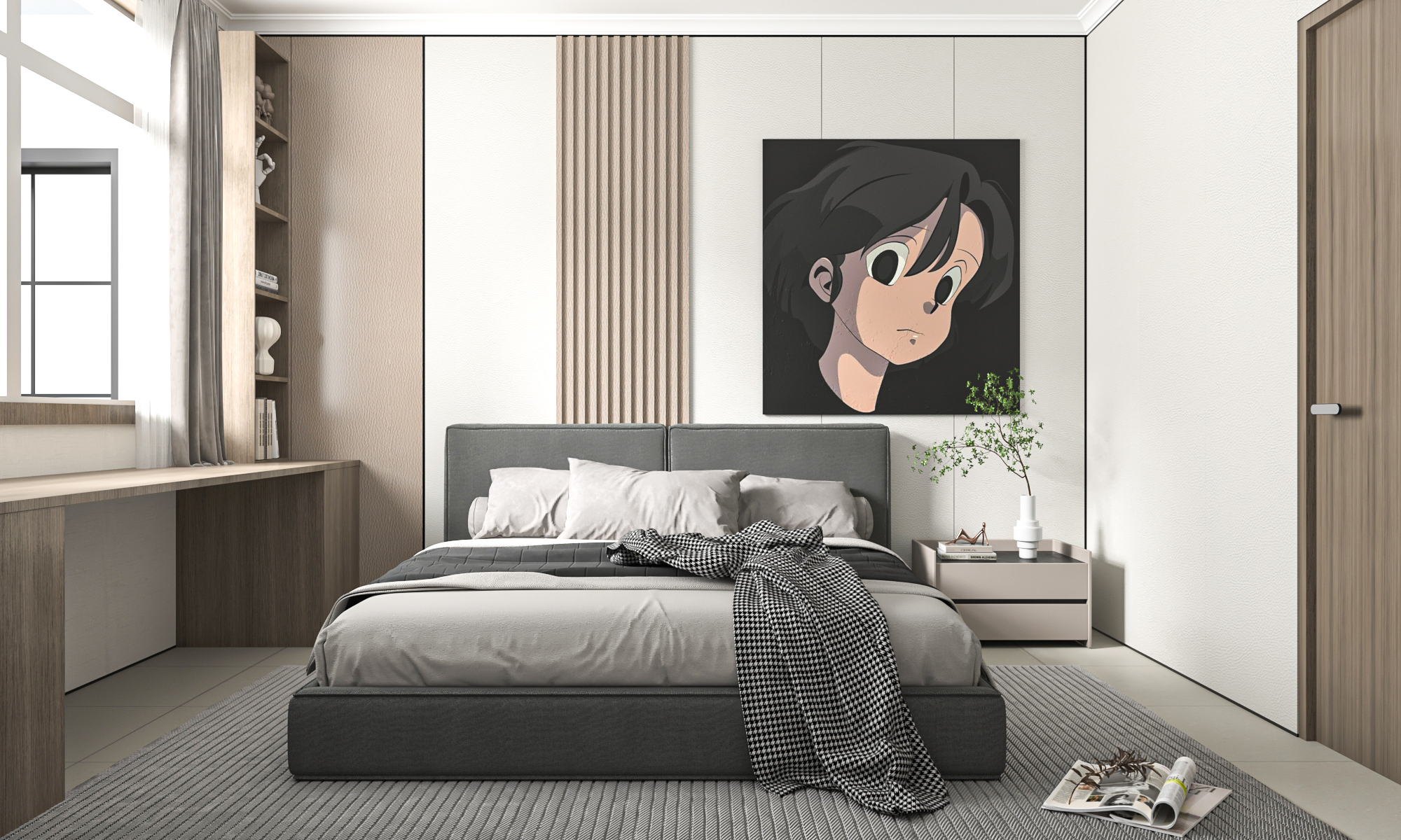 主卧选择浅绿色舒抗板装饰背景墙提升质感,实木地板打造温馨舒适的居家氛围感,深灰色窗帘与整个空间简约大气的格调很搭。主卧重视起居幸福感,设置主卫营造私密空间,不随意添置繁琐饰品,充足的活动空间带来自由感与治愈力。次卧格调与主卧统一,奶咖色床品温柔富有亲和感,毛绒抱枕趣味感十足。家里人口不多,卫生间设置主要考虑实用性,满足家人日常生活需求即可,卫生间设计简约大方。