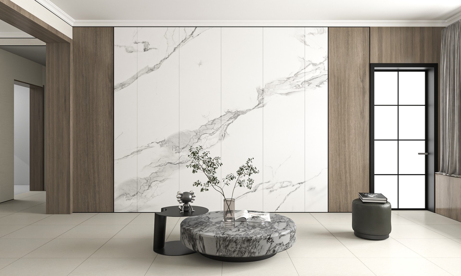 墙面采用灰色系舒抗板,连墙上的挂画都注意到了灰色多层次的运用。